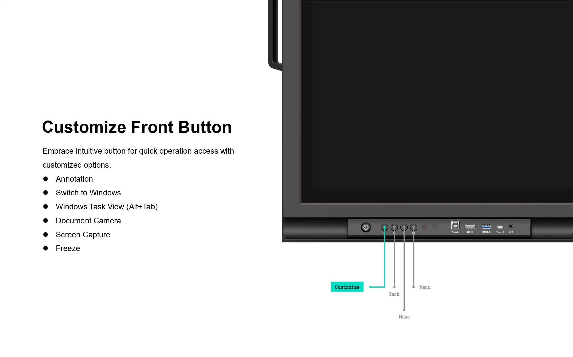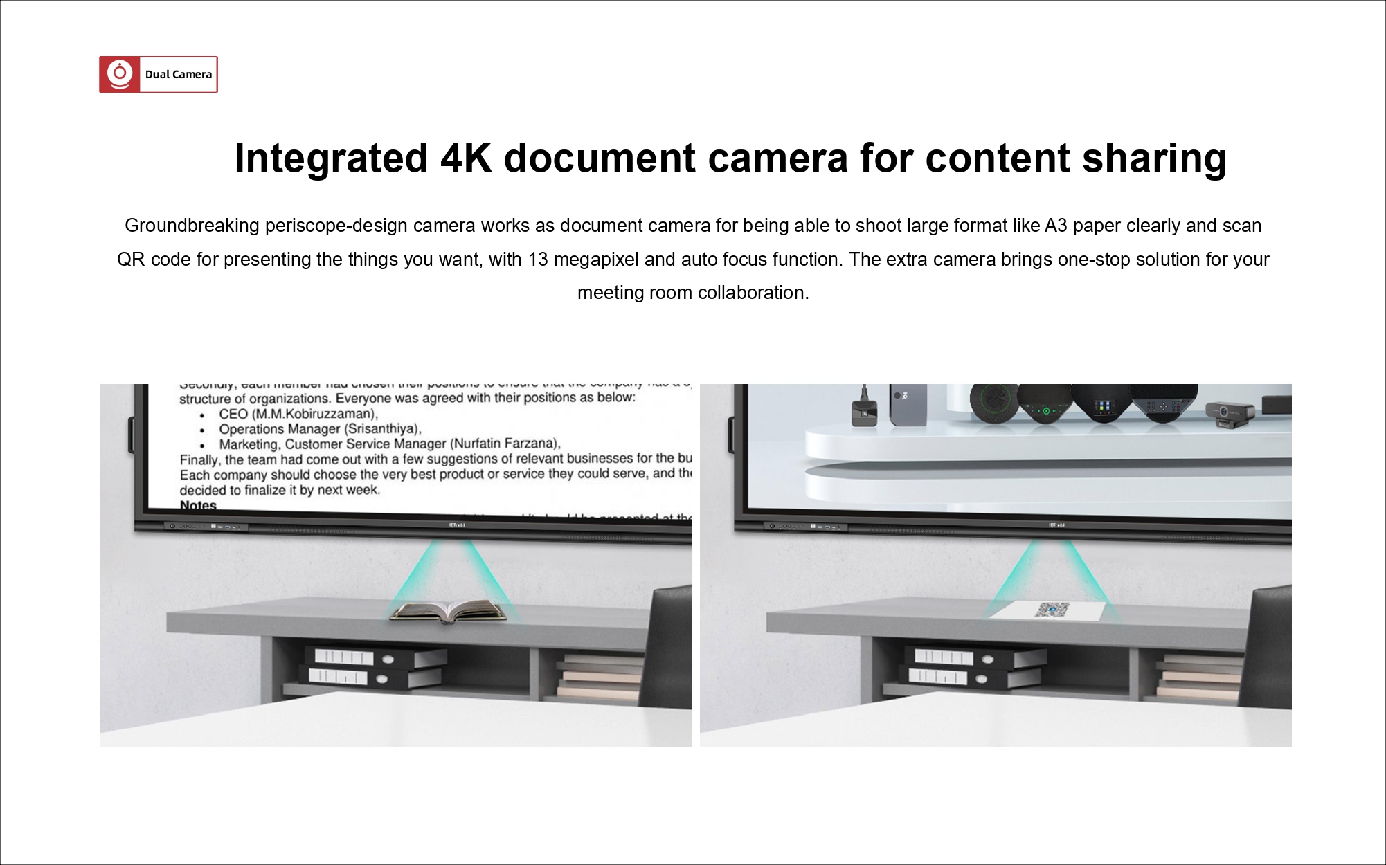 A key feature of the IQTouch HA1100 is its integrated special document camera, which allows users to display, capture, and annotate physical documents or objects in real time directly on the screen. This functionality is perfect for classroom teaching, corporate presentations, and government training, making demonstrations more interactive and impactful.